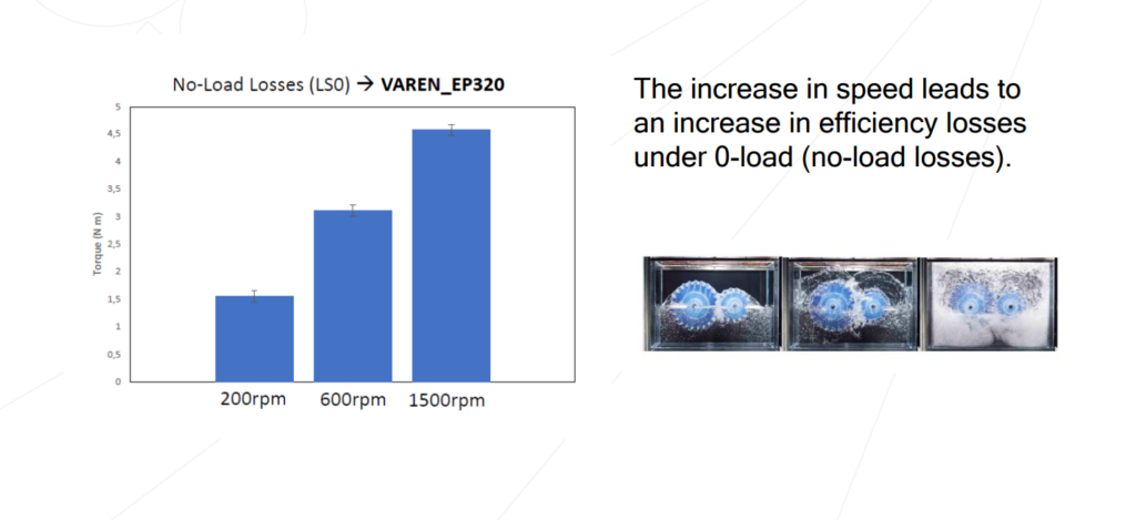 Torque generated in the different load and speed ranges eliminating no-load losses: The lower the torque → the more efficient the oil.